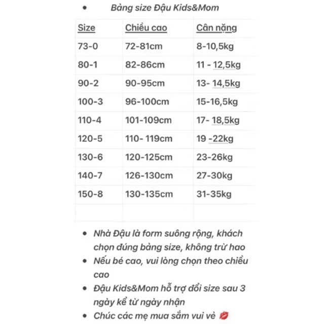 – Bảng size chỉ mang tính chất tham khảo, còn tuỳ thuộc vào số đo cơ thể của mỗi bé khác nhau (chiều cao, tuổi, cân nặng…) và tuỳ thuộc vào chất vải nên sẽ có sự chênh lệch 1-3cm (Tuy nhiên, Shop hỗ trợ đổi size nếu khách hàng không vừa)