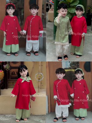 Bộ áo dài bé trai & bé gái màu xanh ngọc đến từ thương hiệu Đậu Kids & Mom mang phong cách thanh lịch – nhẹ nhàng – sang trọng. Thiết kế đồng điệu giữa anh và em, giúp bé lên hình nổi bật, phù hợp cho mùa Tết, chụp ảnh gia đình, lễ hội hoặc những dịp quan trọng tại trường.